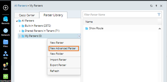 - Go to Parser Library, then click New Advanced Parser from the drop-down menu of a folder. The parser editor will open.