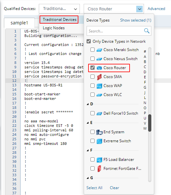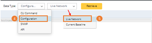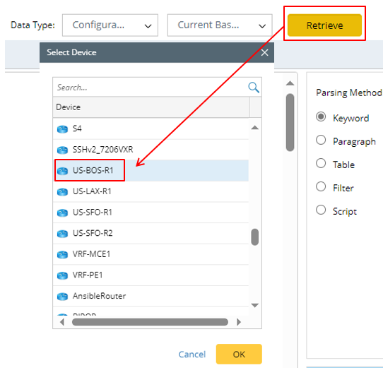 - Click Retrieve and select a device (e.g., US-BOS-R1) to retrieve sample data.