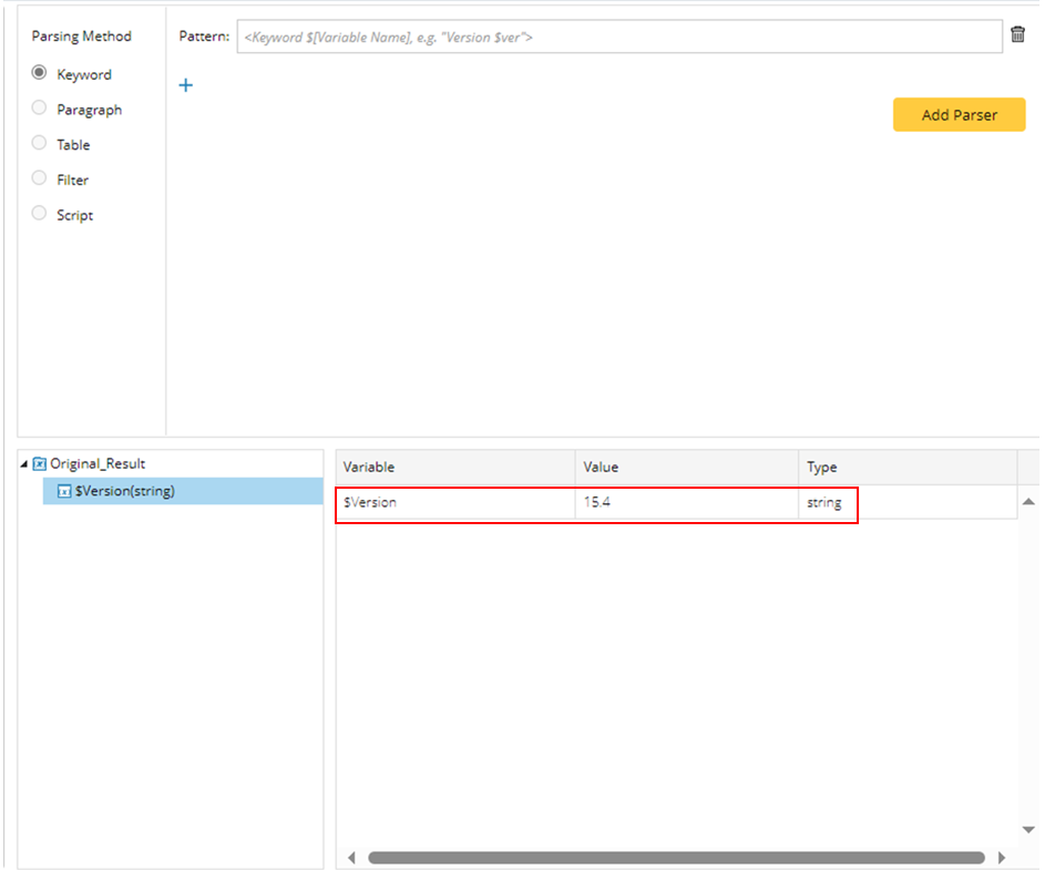- Parser — defines keywords and where a variable is located. The Keyword line pattern Version $var1$,is created automatically. It contains the keywords Version that always stay the same and the variable $var1, which varies in different devices.