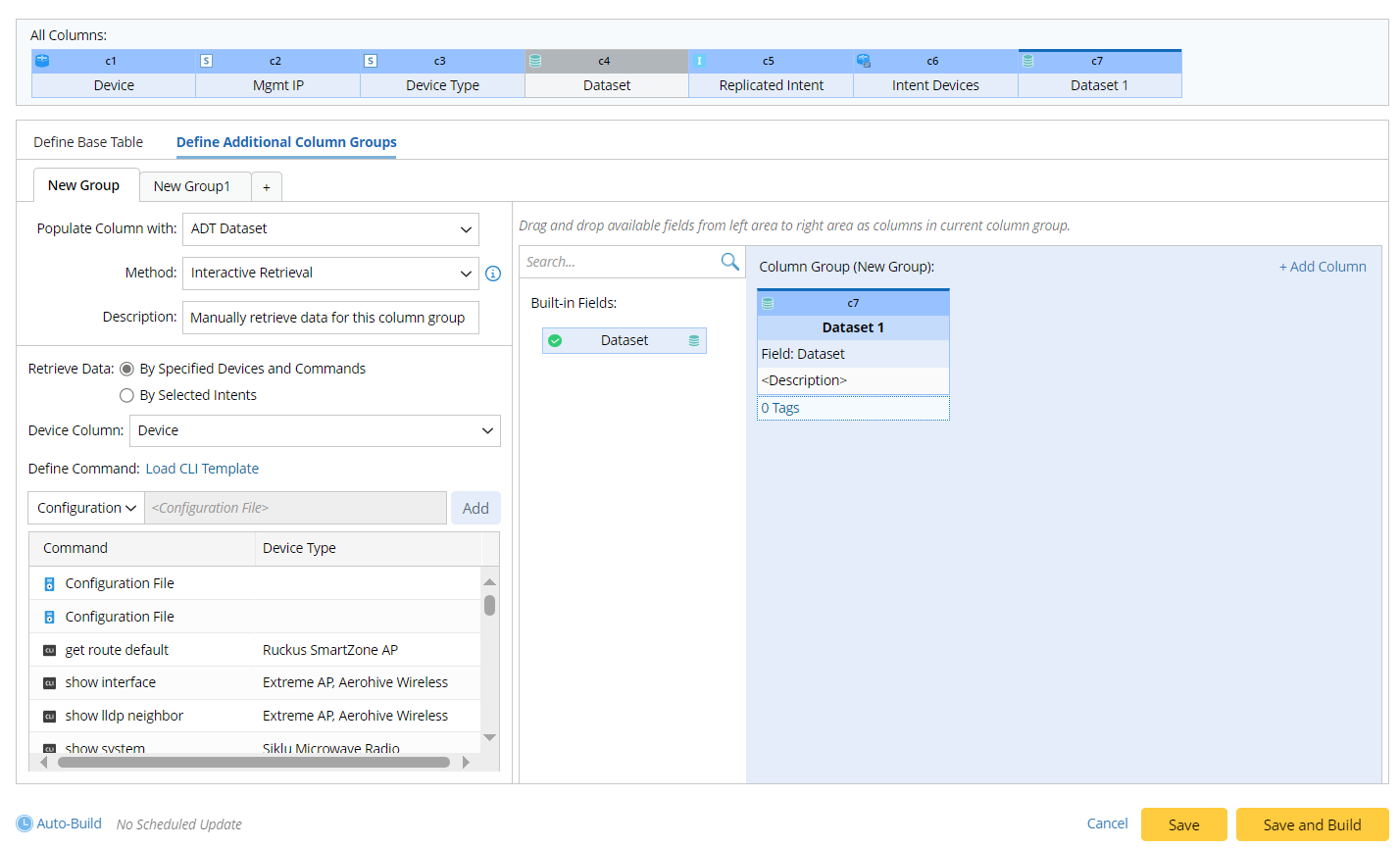 When you use the interactively retrieved data as the source for building Dataset, you can manually add commands to the ADT dataset, then these commands can be manually retrieved later. The main use of this is to create ADT dataset to reflect special network status such as known-good issues, or for debugging intent replication.