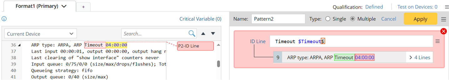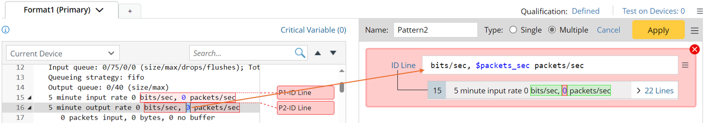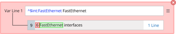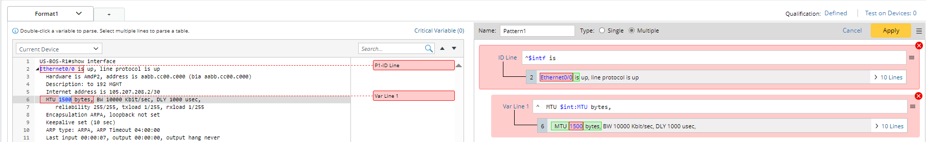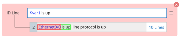 - If a new selected variable is not in the same line with the existing variables, a new line pattern will be generated for the new variable. For example, in the sample data below, double-click “Ethernet0/0” to add line pattern “^$var1 is” first, then double-click “1500”, a new line pattern “^ MTU $int:MTU bytes,” will be generated.