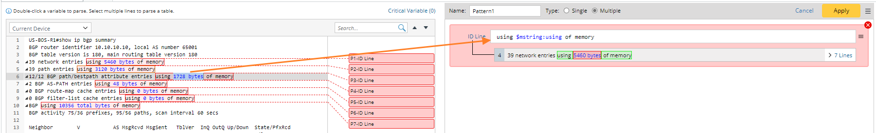 Note: If a number is selected as variable, the system will automatically generate a variable of “$int” type, like $int:mtu. - If several words are selected as a variable, the variable type will be automatically set to “$mstring”. For example, in the sample data below, if “1728 bytes” are selected as a variable, which are two distinct words, the line pattern “using $mstring: using of memory” will be generated.