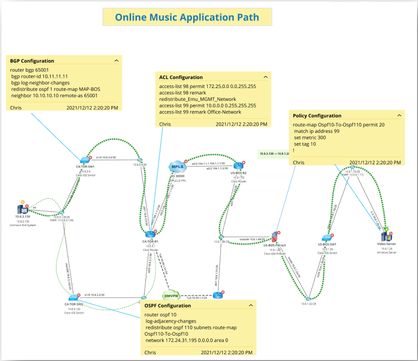 R12 Publication-2025July16 Define and View Reference Map You can define a reference map for a saved path. The path reference map allows you to draw the golden baseline path on the map and use device notes to draw key configlets or troubleshooting recommendations on the map. For example: Use Path Description and Note to Document Path Design Define Path NI for Future Path Diagnose