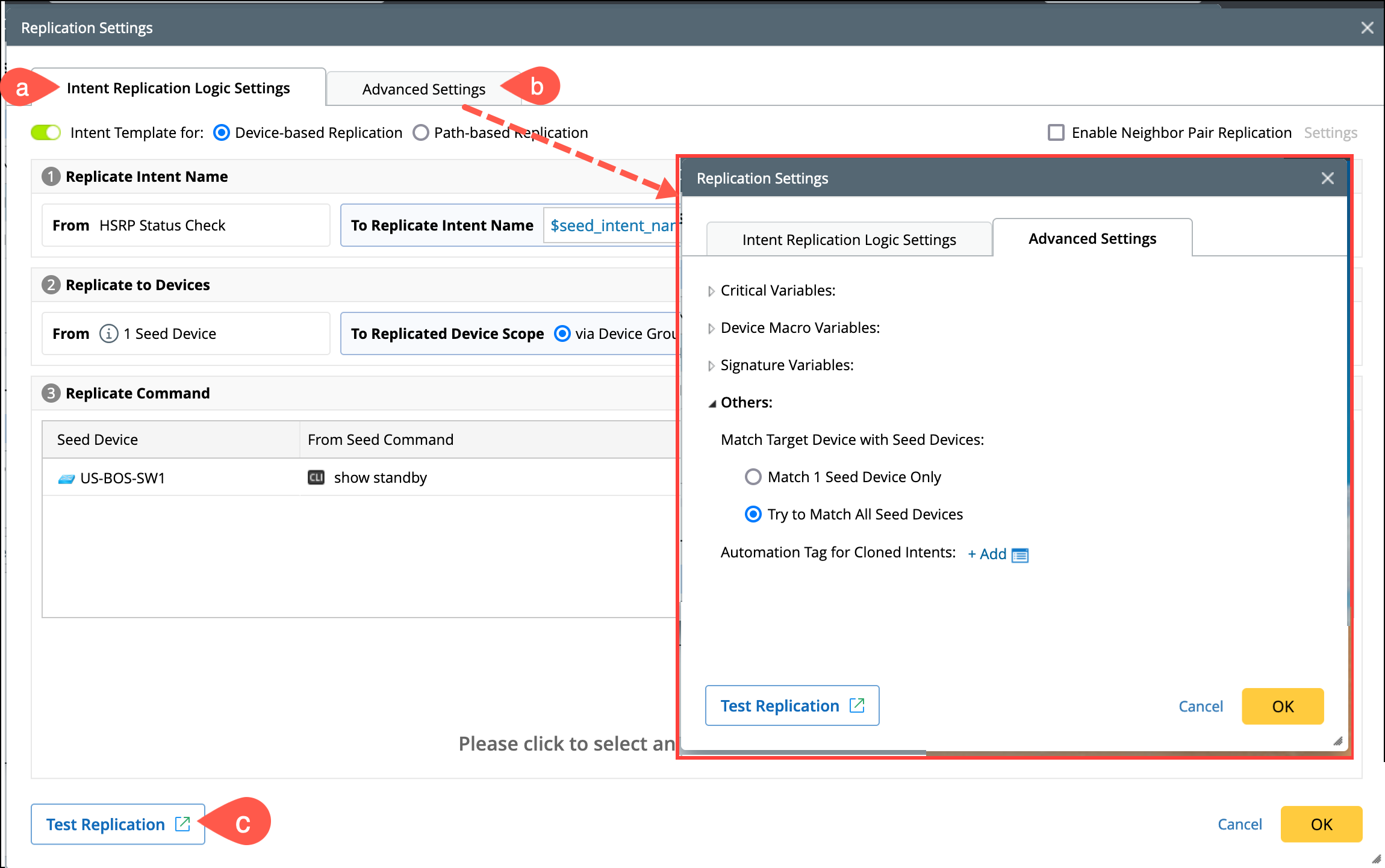 - Intent Replication Logic Settings: Define the replicated intent name, target device qualification, and command qualification.