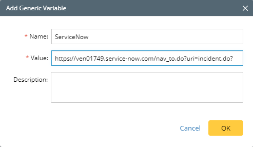For example, your target SPOG URLs usually start with the same string, such as https://ven01749.service-now.com/nav_to.do?uri=incident.do?. You can add a generic variable for it as follows.