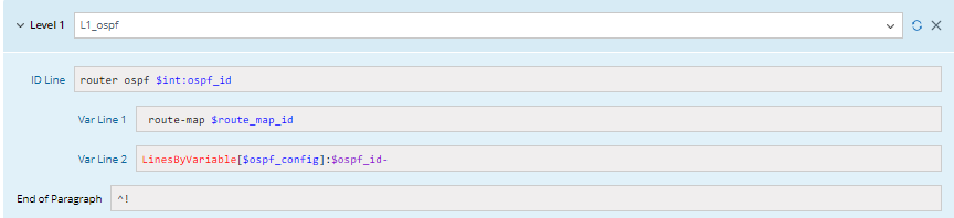 - Parser variable $ospf_config by Parse Lines > The line of variable function using the variable $ospf_id.