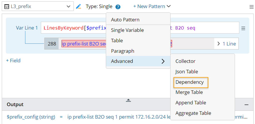 Dependency pattern enhances the ability to parse complex, multi-layered Config-lets for golden configuration checks. In dependency pattern, the parser results of different patterns can be merged in the parsing process to get the desired output, which will be a table variable constructed with all the variables in all the level patterns.