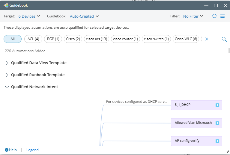 The Guidebook offers network engineers a central location to organize their automation assets (including Data View Template, Network Intent, Network Intent Cluster, and Runbook Template). Leveraging the dynamic Auto-Created Guidebook and manually defined Guidebook, network engineers can quickly narrow down to the desired automation assets (Recommended Automations), thus improving the efficiency of interactive troubleshooting.