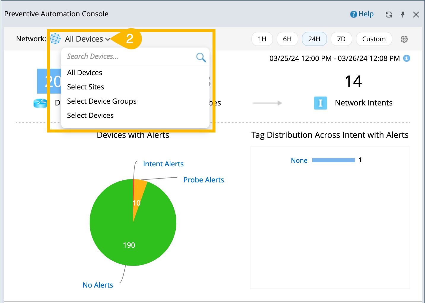 Preventive Automation Console (Dashboard) provides an overview of the network health status and statistics from the Preventive Automation for the entire or partial network. Also, the Preventive Automation Console (dashboard) allows drilling down to any device to view its alert and execution details.