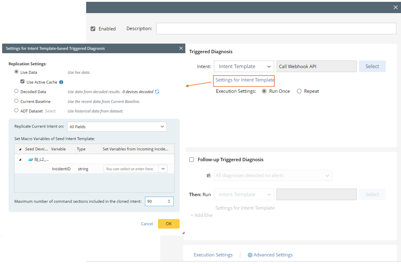 - After the intent template is selected, the Settings for Intent Template-based Triggered Diagnosis dialog will pop out, or you can click Settings for Intent Template, then define the settings in this dialog.
