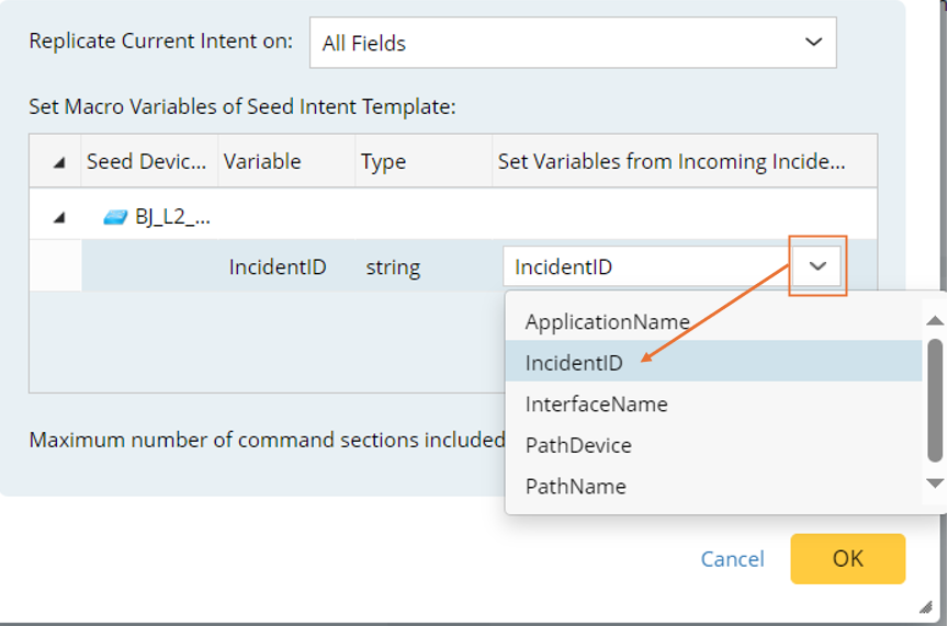 and select data fields of the selected incident, then the values in the data fields will be used as the macro variable values for the seed device. Alternatively, you can directly input macro variable value.