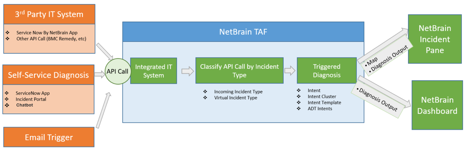Triggered Automation Framework (TAF) provides powerful triggered diagnosis by executing Network Intent automatically for incoming tickets. There are two ways to trigger the diagnosis: an external ticket from the 3rd party system (an API call from the machine to machine) and a self-serviced call from Teams Chat Bot, Emails, ServiceNow App, and Incident Portal (an API call from human to machine). For both types of trigger, TAF matches it with suitable intent based on pre-defined criteria to perform triggered diagnosis. The results are displayed in the Incident Pane and third-part Apps (e.g., ServiceNow App) and Dashboard.