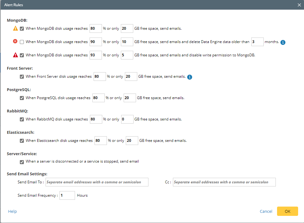 To proactively prevent the system database from data loss or even corruption, you can customize MongoDB, Front Server, and Elasticsearch disk alert rules with progressive quotas assigned. When the usage reaches the predefined threshold, specified users can be notified by both email alerts and system alerts. Each rule defines different actions with two conditions of the disk usage threshold. The corresponding action will be triggered when either condition is met. The thresholds are all configurable.