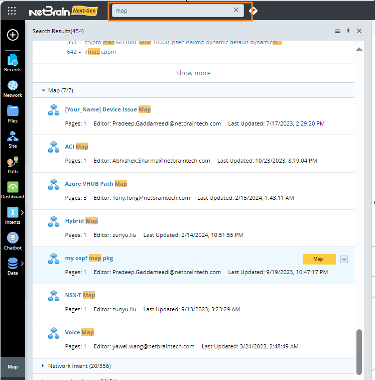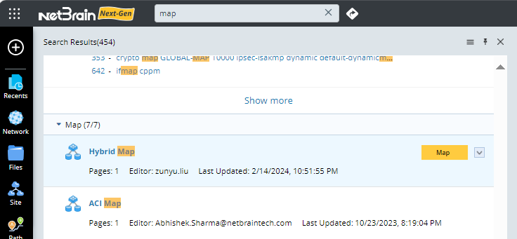 For an existing map, you can find and open the map from the file folders or from the desktop. As the number of map files gradually increases in your domain, you can search and open a map from the search results. For site maps and device group maps, you can open the site maps or device group maps from the corresponding site or device group.
