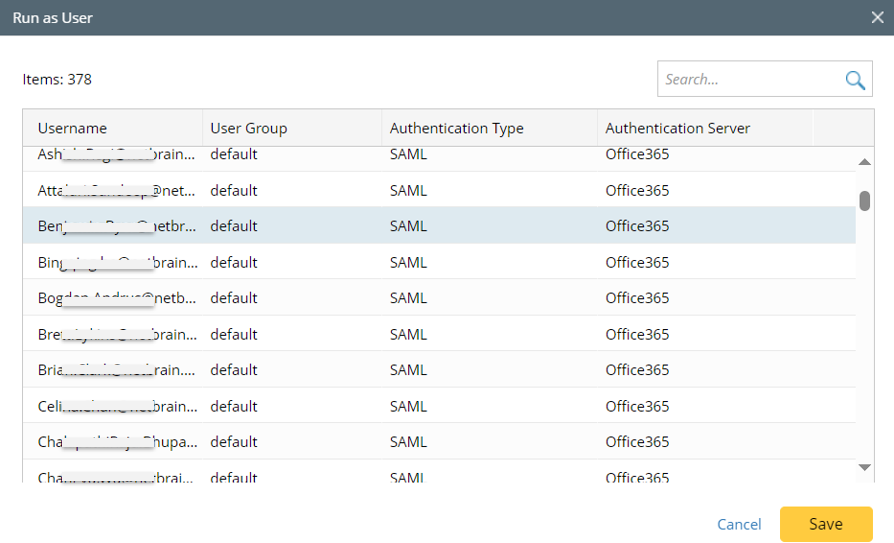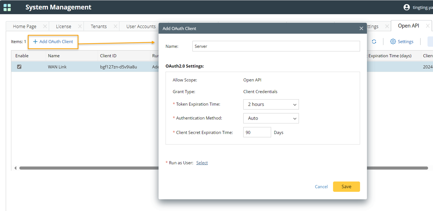 - Run as User: Click Select in this field, then the Run as User dialog will pop up. In this dialog, select a user associated with the current client ID, then the OAuth Client will run with the same privilege as the selected user.