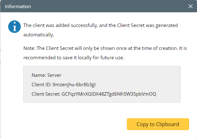 - Click Save in the Add OAuth Client window, an information dialog will appear to provide information about the client secret. Users are prompted to keep the Client ID and Client Secret information.
