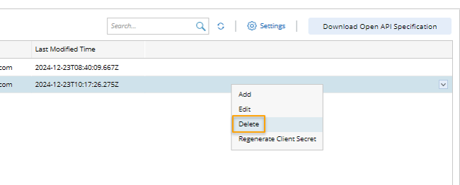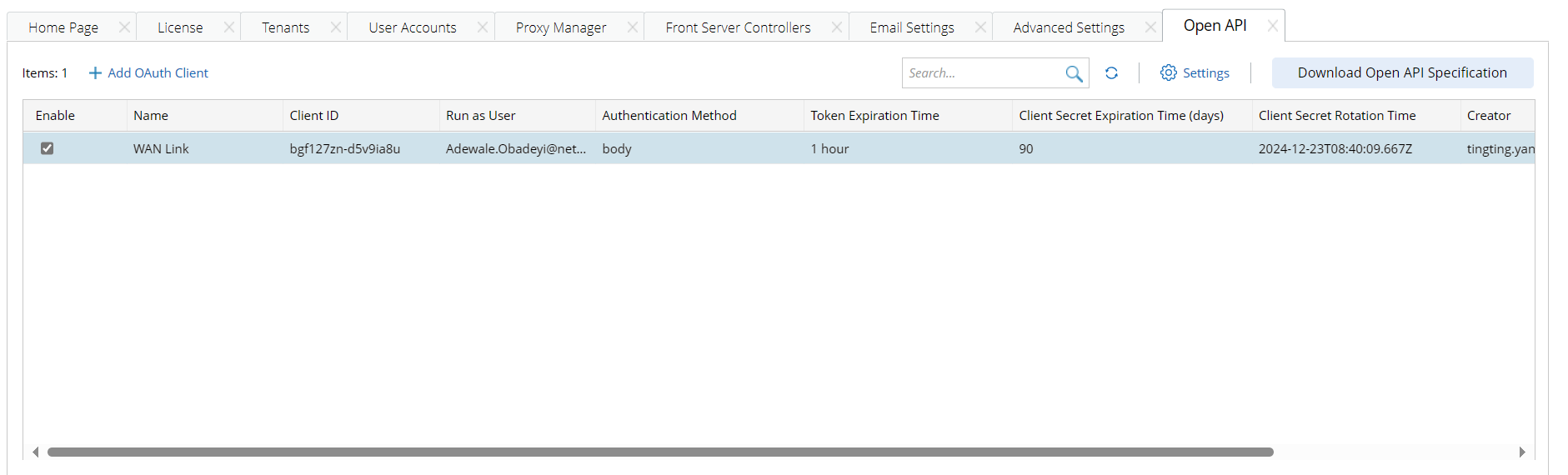 - View the added OAuth Client. A new OAuth Client will be added as an entry in the Open API table.