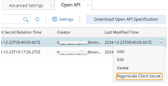 - From the dropdown menu of the target OAuth Client, click Regenerate Client Secret.