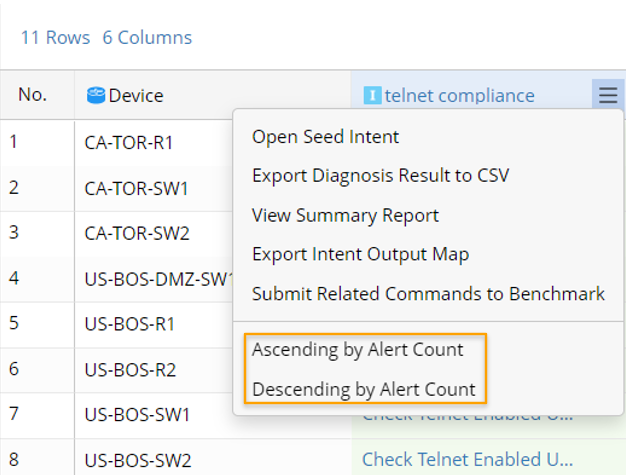 - For the intent columns in ADT, the entries in the intent column are sorted by the count of Alerts, in ascending order or descending order.
