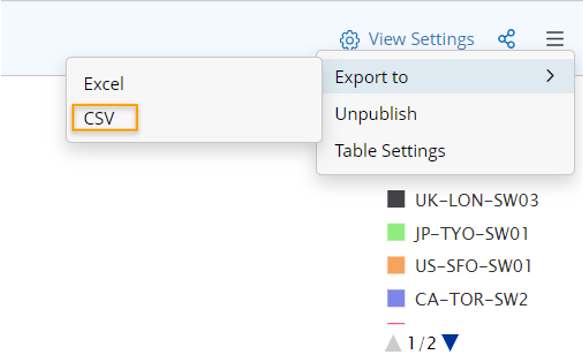 icon from a view to open the main menu of view. - Select Export to > CSV. The view will be exported to CSV format and will be saved in the local default folder.