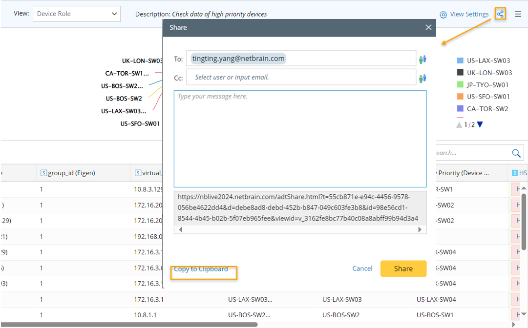 Alternatively, you can click Copy to Clipboard to share the URL to the view with other users. - Click Share.