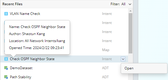 Recent files can be filtered by type, and by default, all recent files are displayed.