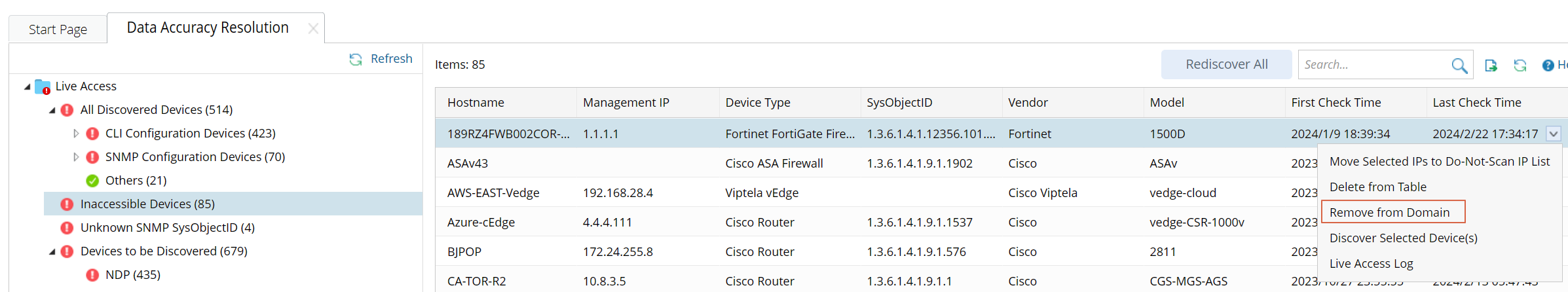 - On the Tune Live Access tab, open the fine tune result table, check the box and right-click the target device to select Remove from Domain.