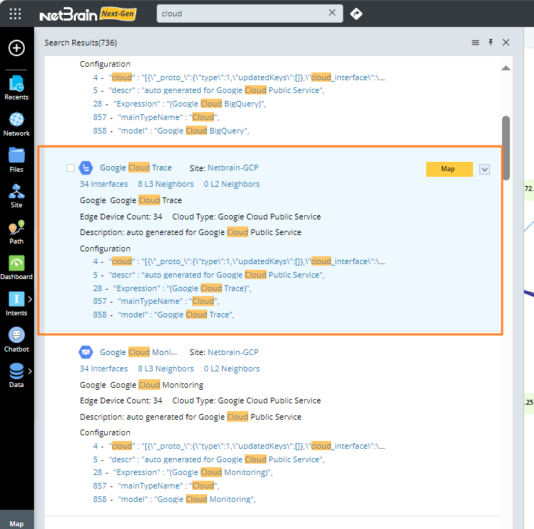 Note: In the search results, the cloud type of the searched-out cloud will be displayed. The NetBrain System supports five cloud types: MPLS L3 VPN, AWS Public Service, Google Cloud Public Service, Aryaka DC Cloud, and Internet Cloud.
