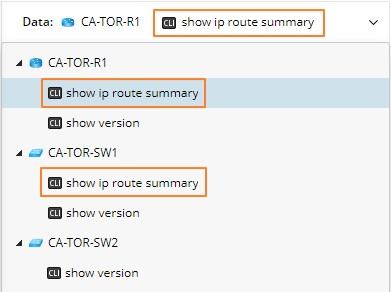 For example: Devices CA-TOR-R1 and CA-TOR-SW1 are matching devices as they have the selected command show ip route summary, but the device CA-TOR-SW2 is not.