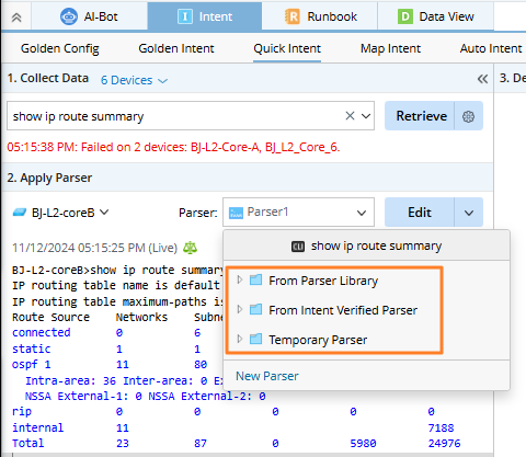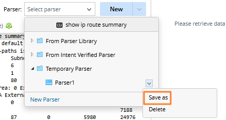 - Parser Library: List the parsers matching the selected devices and commands/configurations.