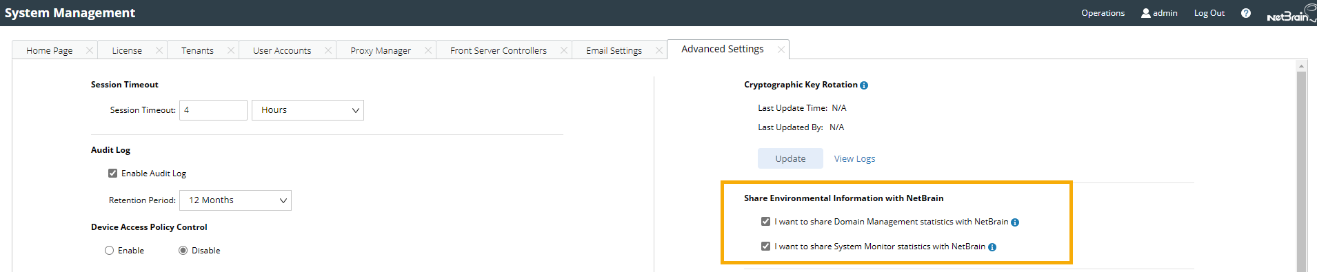 - On the Advanced Settings tab, move to the Share Environmental Information with NetBrain area, and select the following two checkboxes to enable data collection.