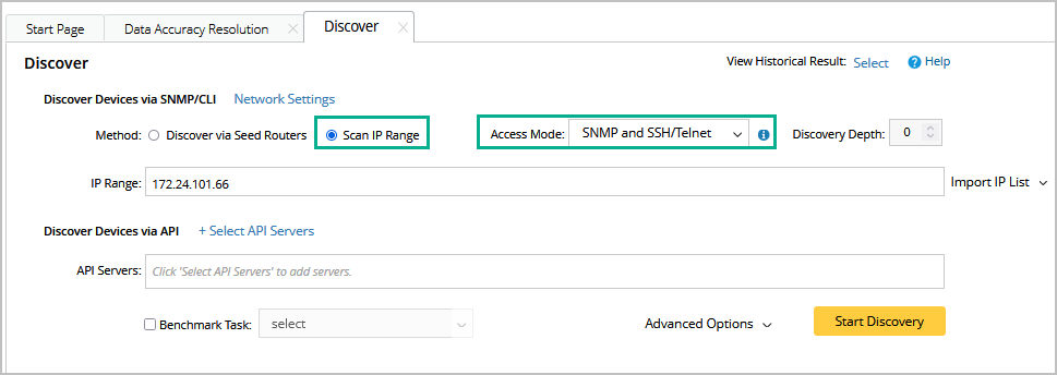 - Select an access mode, check the Scan IP Range radio button, and click Start Discovery to rediscover the IP addresses.
