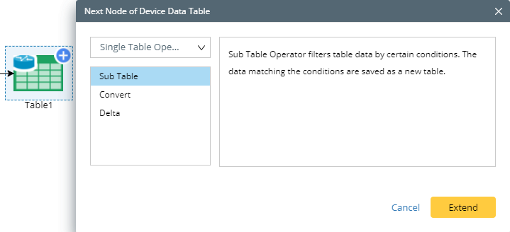 The Sub Table operator filters table data by customized conditions. The data matching the conditions are saved as a new table.