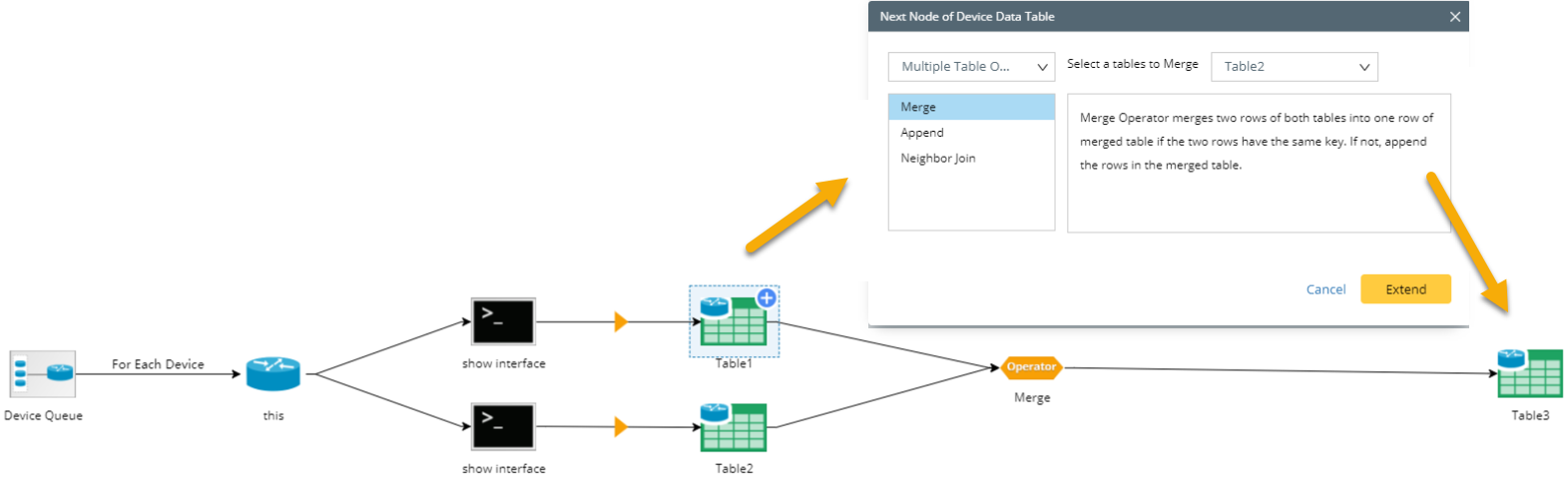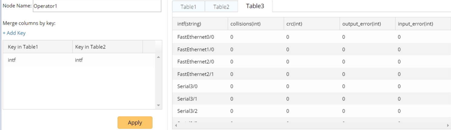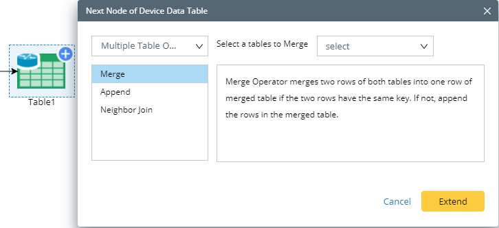 The Merge operator is used to merge the variables from two tables to generate a new table based on a metric the two tables have in common. The Merge operator is only applicable when the two tables come from the same Device node.