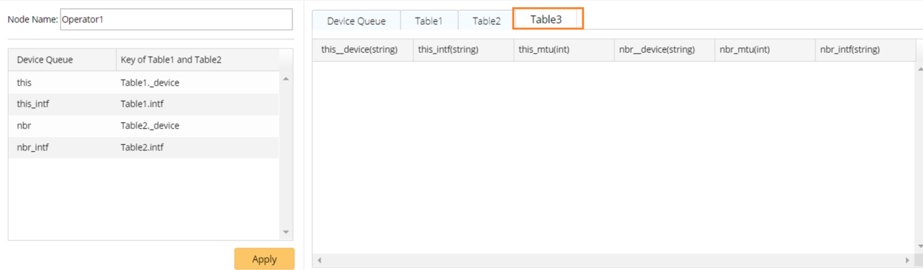 The Neighbor Join operator is used to join the variables of a device and those of its neighbor devices to a new table based on the Neighbor Pair in the Device Queue. It is only applicable when you select Neighbor Pair as device input in the Device Queue node and extend related neighbor device nodes.