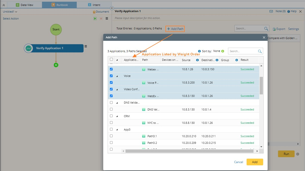 When you select paths to add them to the Verify Application node of a runbook, the applications will be listed and sorted by weight from high to low.