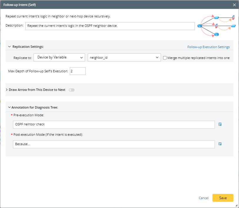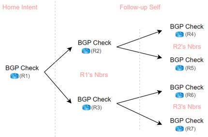 Use follow-up self to execute recursive diagnosis across multi-level neighbors, for example, check OSPF neighbors.