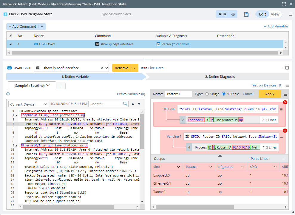 - Create a NI “OSPF Neighbor Check” and add CLI diagnosis for device “US-BOS-R1”. Get a parsed table by command show ip ospf neighbor.