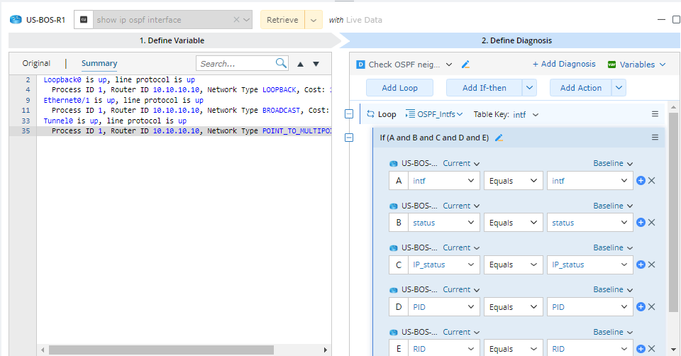 - Define the diagnosis to check OSPF parameters with baseline.