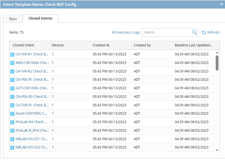 For an intent installed in the IBA center in the Template Mode (NIT), after the NIT is decoded, a number of intents can be cloned from this decoded NIT by triggered automation or preventive automation. The system allows you to view the intents cloned from an NIT in a convenient way under the Cloned Intents Tab after selecting the NIT.