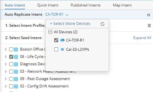 In the Auto Replicate Intent pane, devices associated with the map can be selected to filter intents. By default, all the map devices of the current map are selected. As you check/uncheck devices, the matched intents below change at the same time.