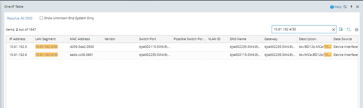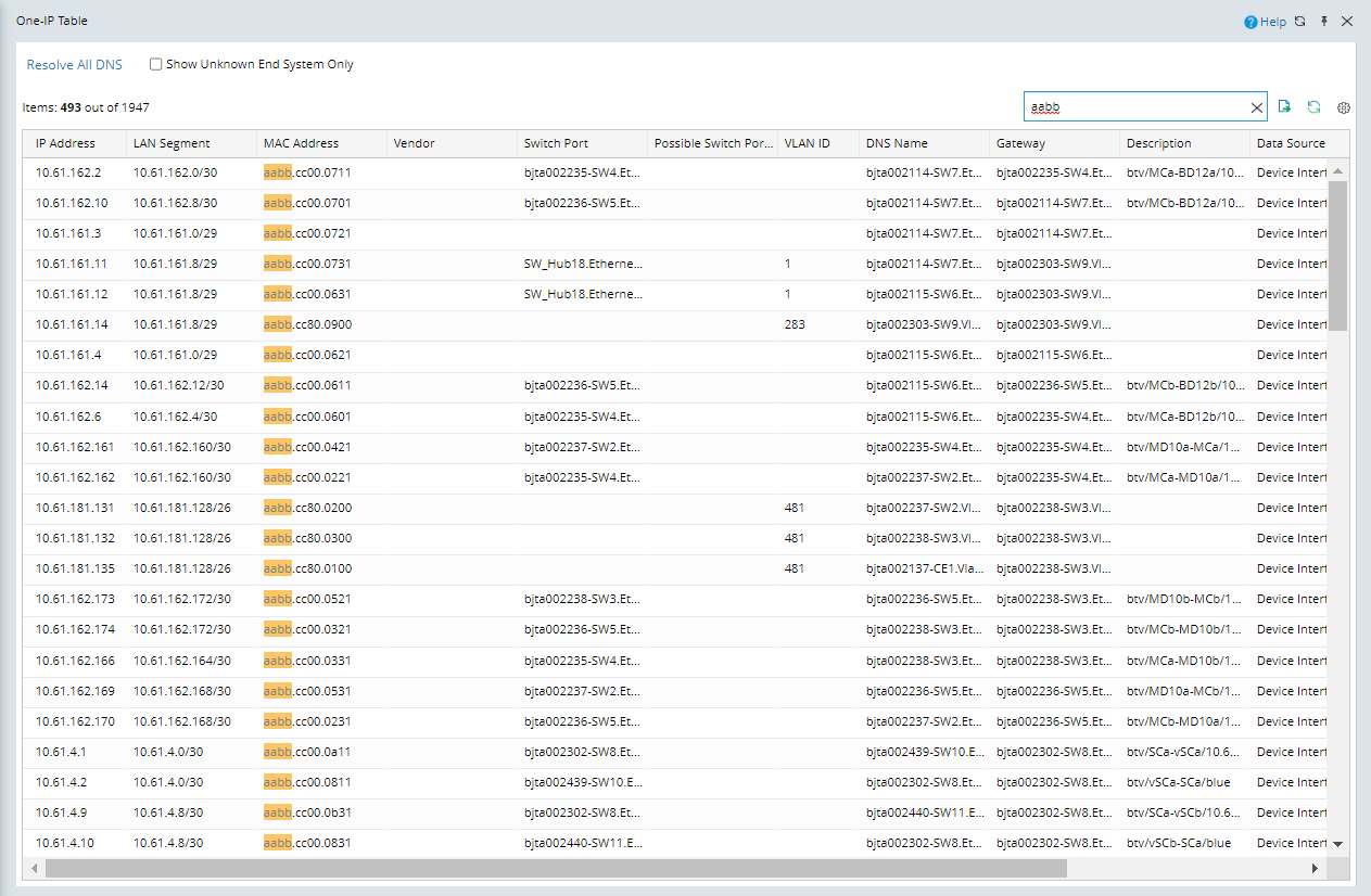 You can search the One-IP table by entering a search item in the search bar, which can be IP Address/LAN Segment/MAC Address/DNS Name/VLAN Group/VLAN ID/Switch Port. All columns of the One-IP table are in the search scope, except for Data Source and Data Retrieve.