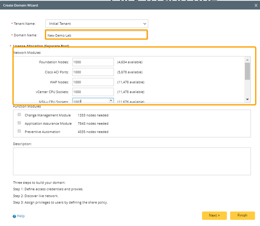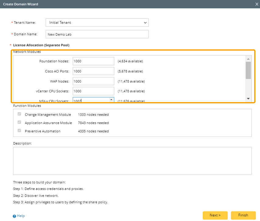 - For the separate module License: you need to enter the maximum units for each network module in your license, such as Foundation Nodes, Cisco ACI Ports, etc.
