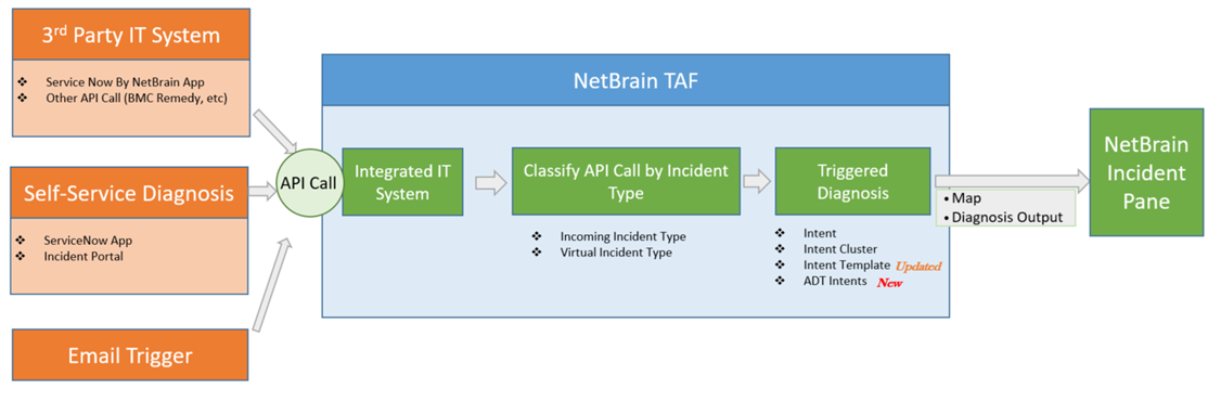 Triggered Automation Framework (TAF) provides powerful triggered diagnosis by executing Network Intent automatically for incoming tickets. There are two ways to trigger the diagnosis: an external ticket from the 3rd party system (an API call from the machine to machine) and a self-serviced call from Teams Chat Bot, Emails, ServiceNow App, and Incident Portal (an API call from human to machine). For both types of trigger, TAF matches it with suitable intent based on pre-defined criteria to perform triggered diagnosis. The results are displayed in the Incident Pane and third-part Apps (e.g., ServiceNow App).