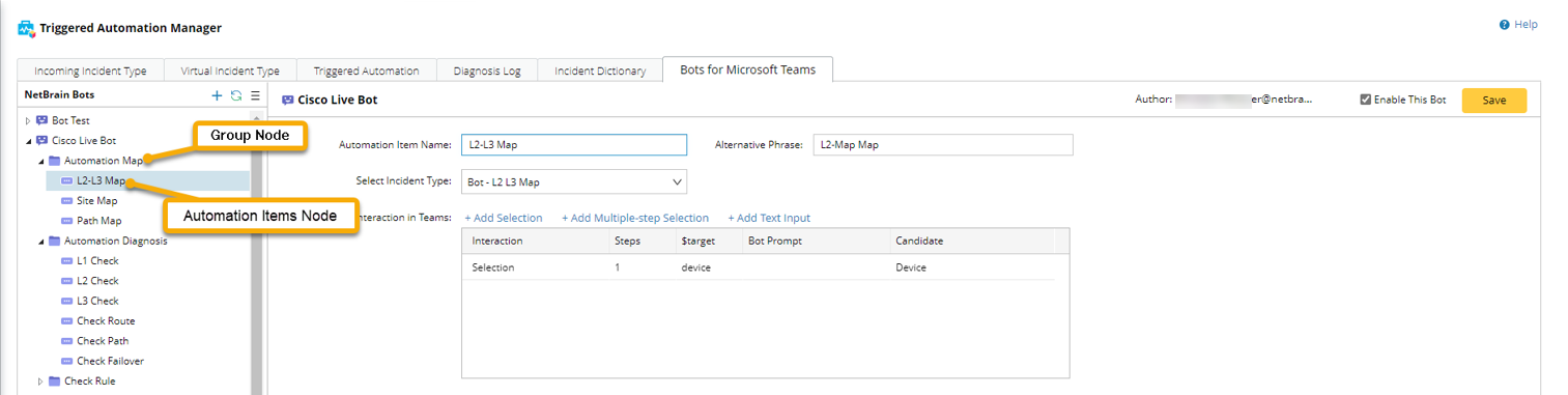Power users created three group nodes: Automation Map, Automation Diagnosis, and Check Rule under the Cisco Live Bot in NetBrain IE.