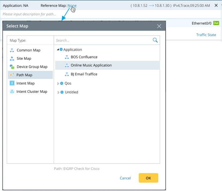 2023-Nov-03-R11.1a Define and View Reference Map You can define a reference map for a saved path. The path reference map allows you to draw the golden baseline path on the map and use device notes to draw key configlets or troubleshooting recommendations on the map. For example: