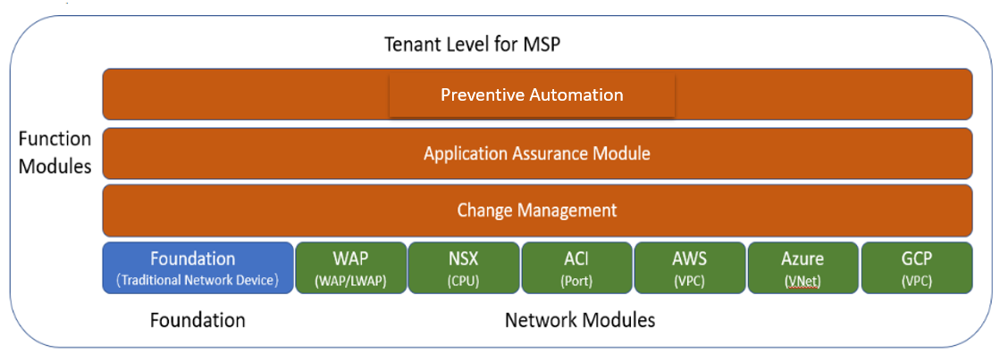 As depicted in the above diagram, the Foundation Module applies to the traditional network devices, while the Network Module can be further divided by various emerging network technologies.