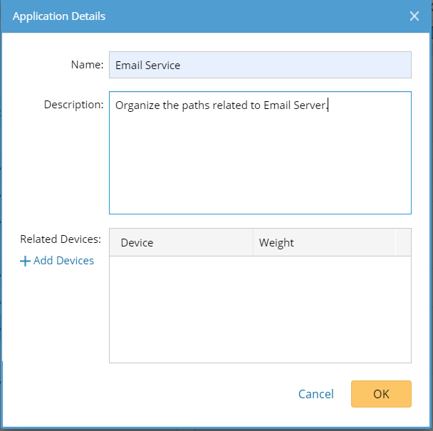 Tip: Each related device has a default weight value of 10, and you can double-click to modify the value. The weight is used to sort the application list order. See Application Weight for details. - Click OK.