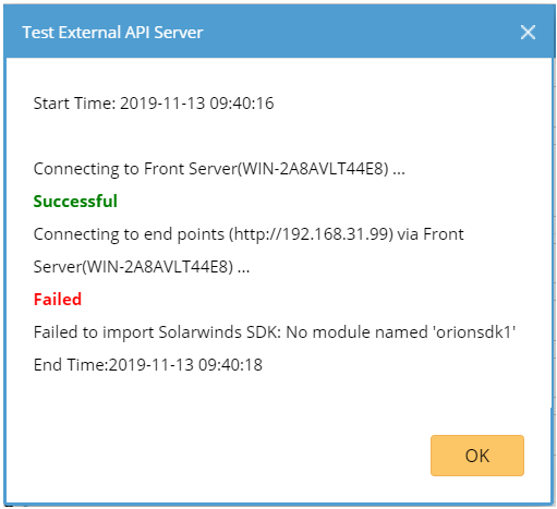 Error Scenario: SolarWinds endpoint is unreachable. Possible Resolution: Confirm that the NetBrain Front Server(s) can reach the SolarWinds platform using 3rd party tools (Ping, Traceroute, Wireshark) | ![]() |