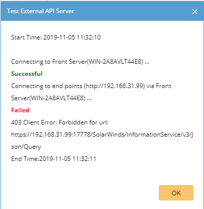 - Click Test to initiate a connectivity test between the NetBrain front server and the SolarWinds instance configured.
